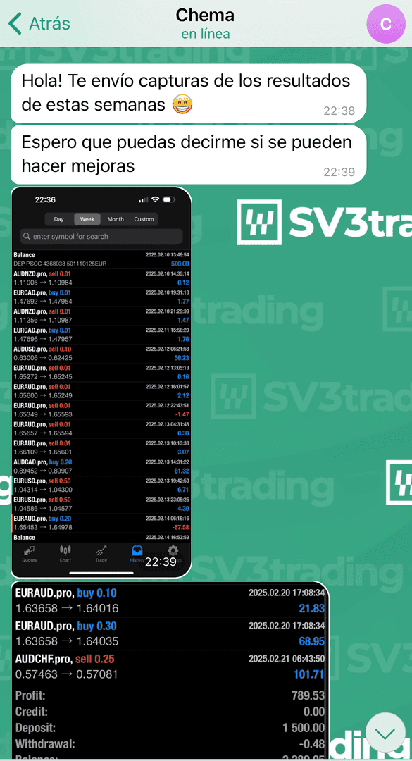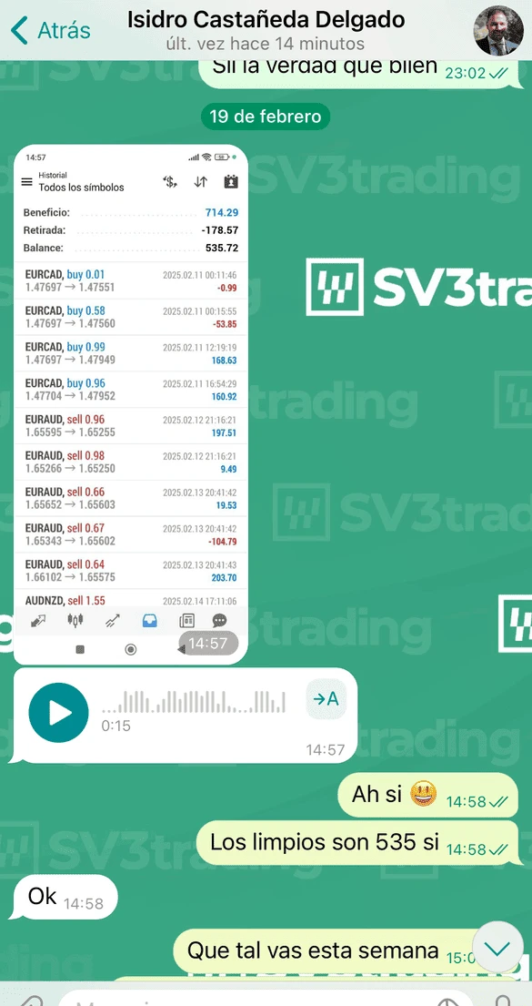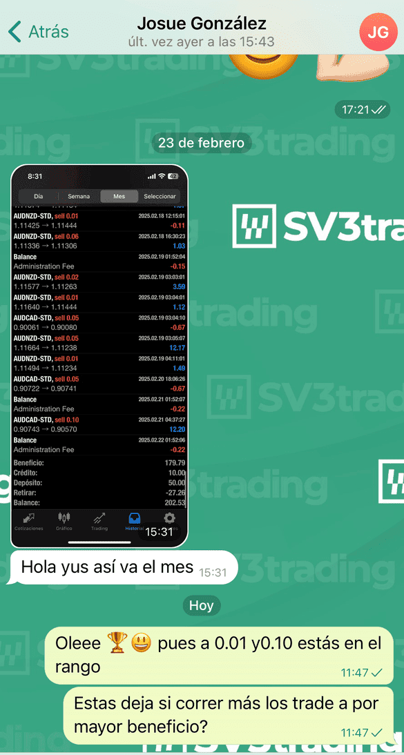 Hola gente soy de Perú, de tantas academias que he seguido, incluyendo en Colombia, argentina pensé que nunca encontraría la honestidad en información en las clases bien estructuradas y sencillas y la estrategia con muy buenos fundamentos para tener excelentes resultados en la operatividad. Muy agradecido con sv3trading y Yuss por la oportunidad de ser parte de esta gran familia.🙌