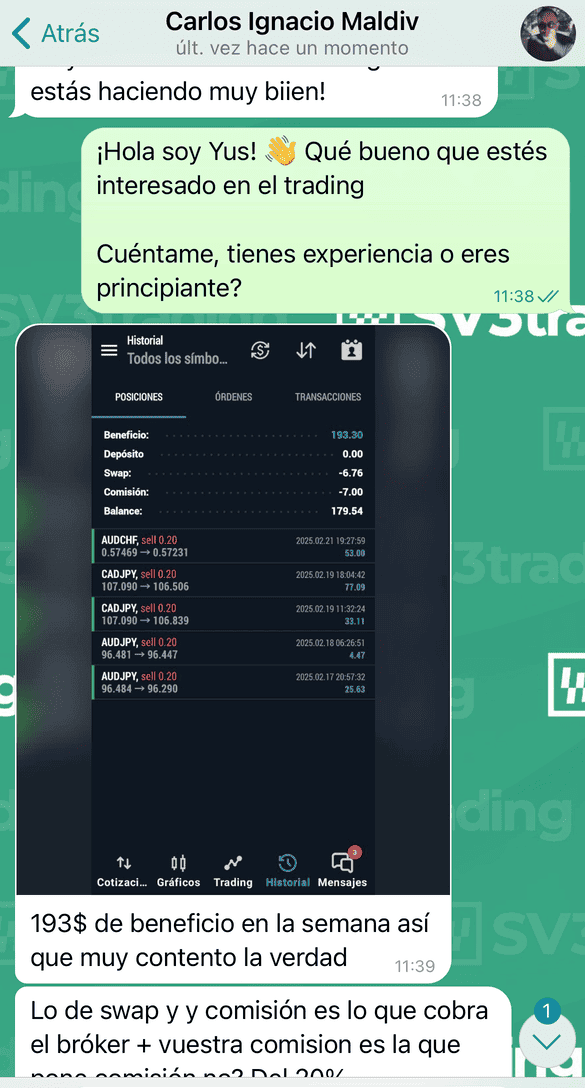 Llevo unos 4 meses con SV3, desde el inicio Yus fue muy claro, el contenido de la academia que he visto de momento es bastante bueno y me está ayudando a comprender mejor el mercado y el mundo del trading, y Yus en cuanto puede resuelve las dudas que tengo con audios y ejemplos que me ayudan mucho, además de dar consejos sobre inversión si de los pides de una forma razonada y mandando ejemplos gráficos. Además